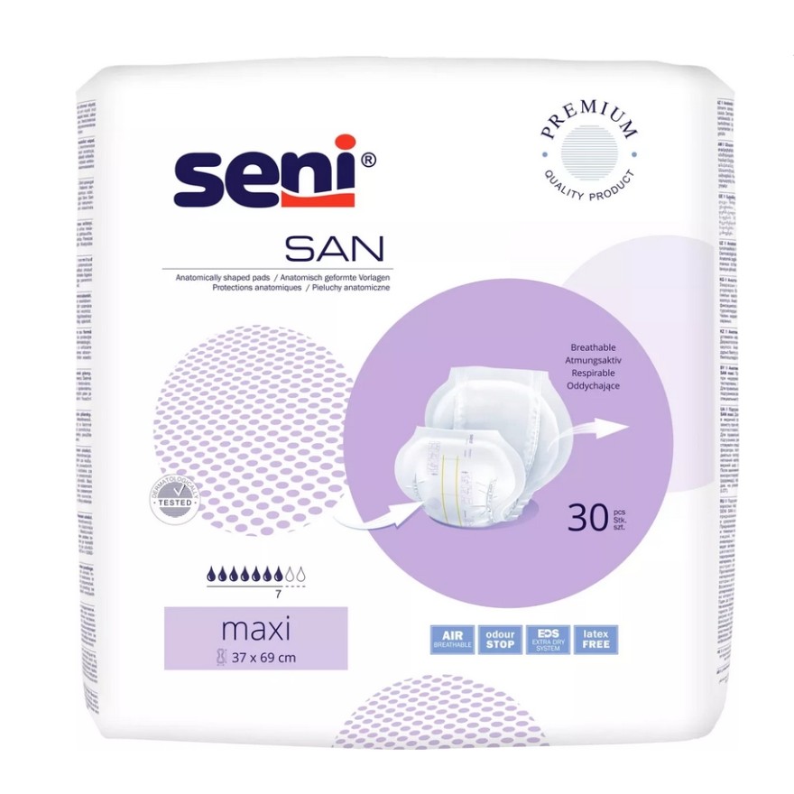 Absorbantele cu forma anatomica San Seni Maxi, sunt solutia perfecta pentru persoanele cu probleme de incontinenta grava. Pot fi utilizate si pentru incontinenta mixta.