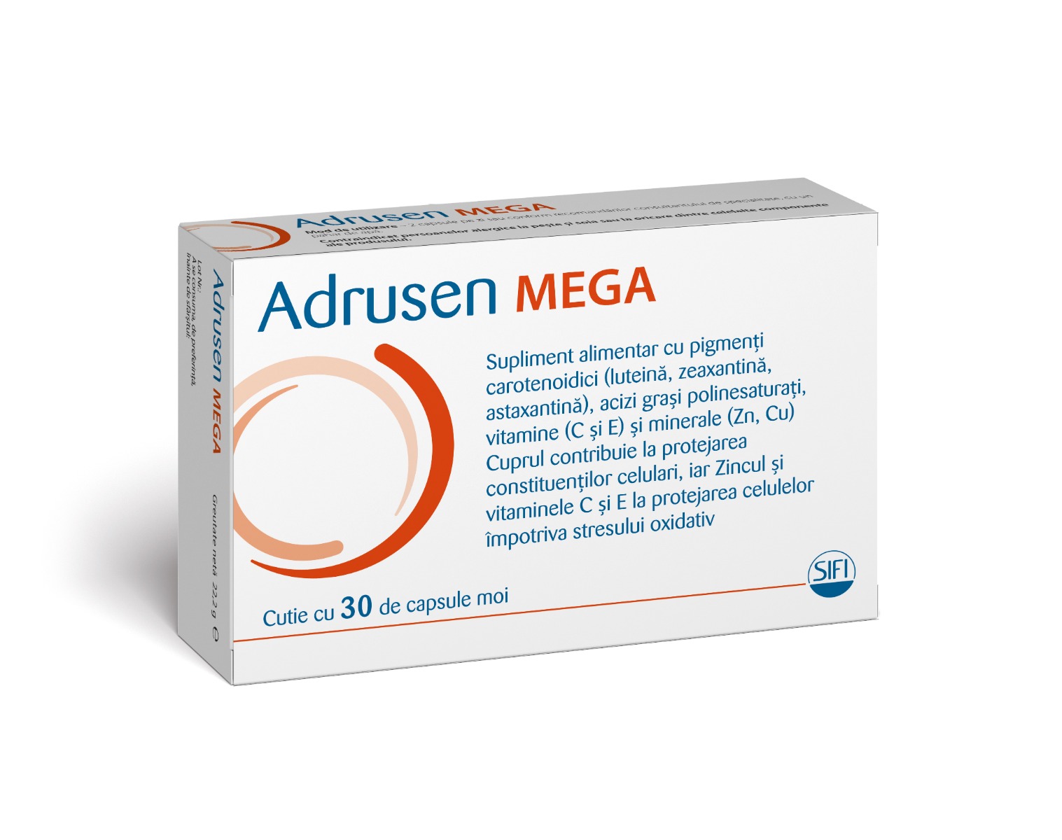 Adrusen Mega este un supliment nutritiv pe baza de luteina, zeaxantina, astaxantina, omega-3, vitamina C, vitamina E, zinc si cupru.