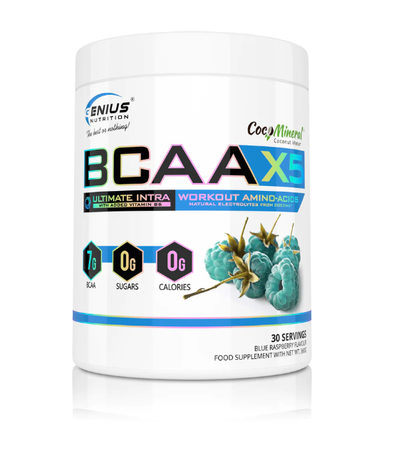 Profită reduceri și preț mic la Aminoacizi pudra cu aroma de zmeura albastra BCAA-X5, 360g, Genius Nutrition, numai la Dr. Max.