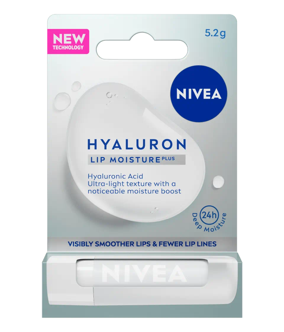 Balsam de buze Nivea Hyaluron 4.8g, cu acid hialuronic pentru hidratare intensa 24h si buze vizibil mai catifelate.