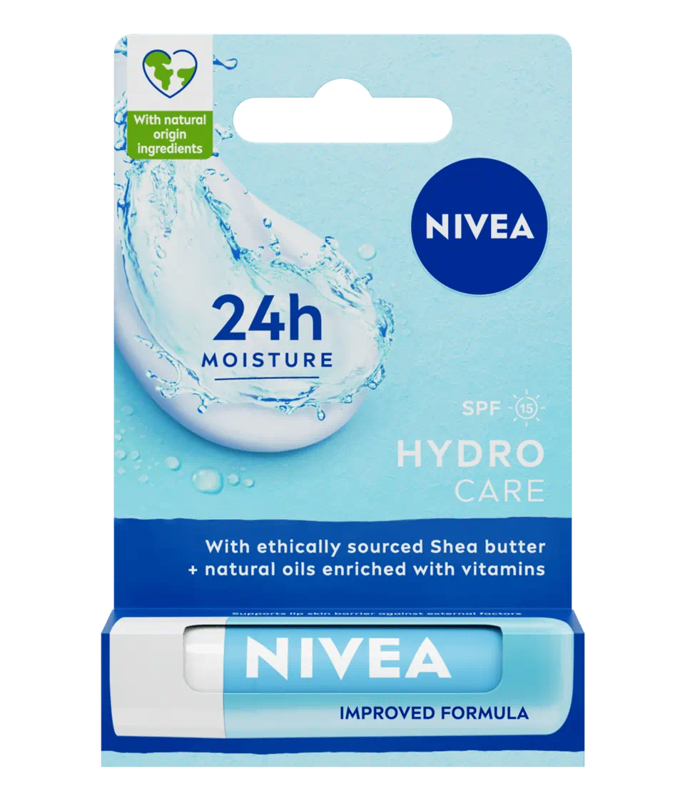 Balsam de buze Nivea Hydro Care 4.8g, formula hidratanta cu ingrediente naturale si FPS15, pentru buze netede si protejate.