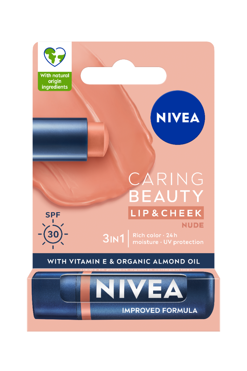 Balsam de buze si obraji Nivea Nude 3.8g, 3-in-1, cu hidratare 24h, culoare intensa si protectie solara FPS30.