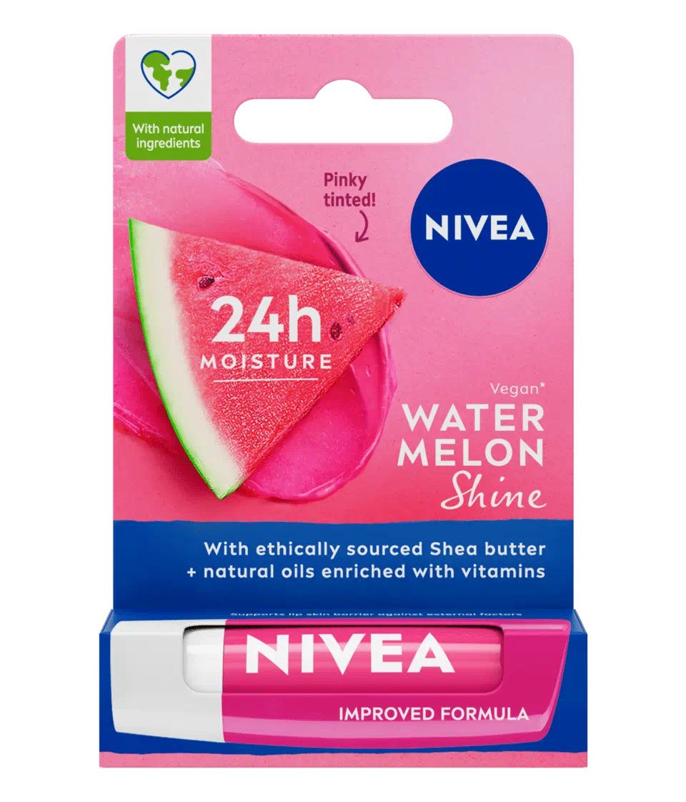 Balsam de buze Nivea Watermelon 4.8g, cu aromă de pepene verde, strălucire roz delicată și hidratare 24h, formulă vegană fără uleiuri minerale.