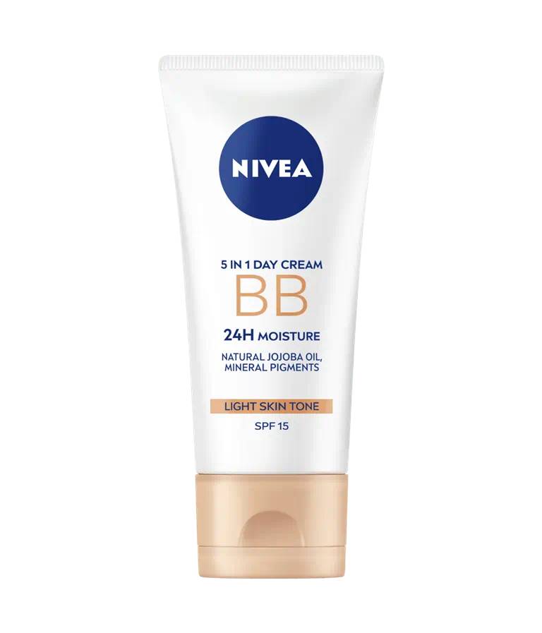 BB Cream 5 in 1 nuanta Light, 50ml, Nivea hidrateaza 24h, uniformizeaza nuanta tenului, acopera imperfectiuni si ofera protectie UV FPS 15.