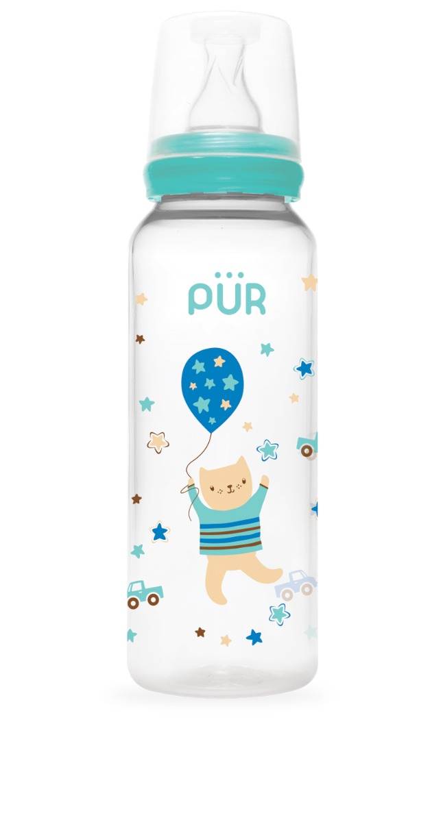 Profită reduceri și preț mic la Biberon cu desen verde +3 luni, 250ml, PUR, numai la Dr. Max.