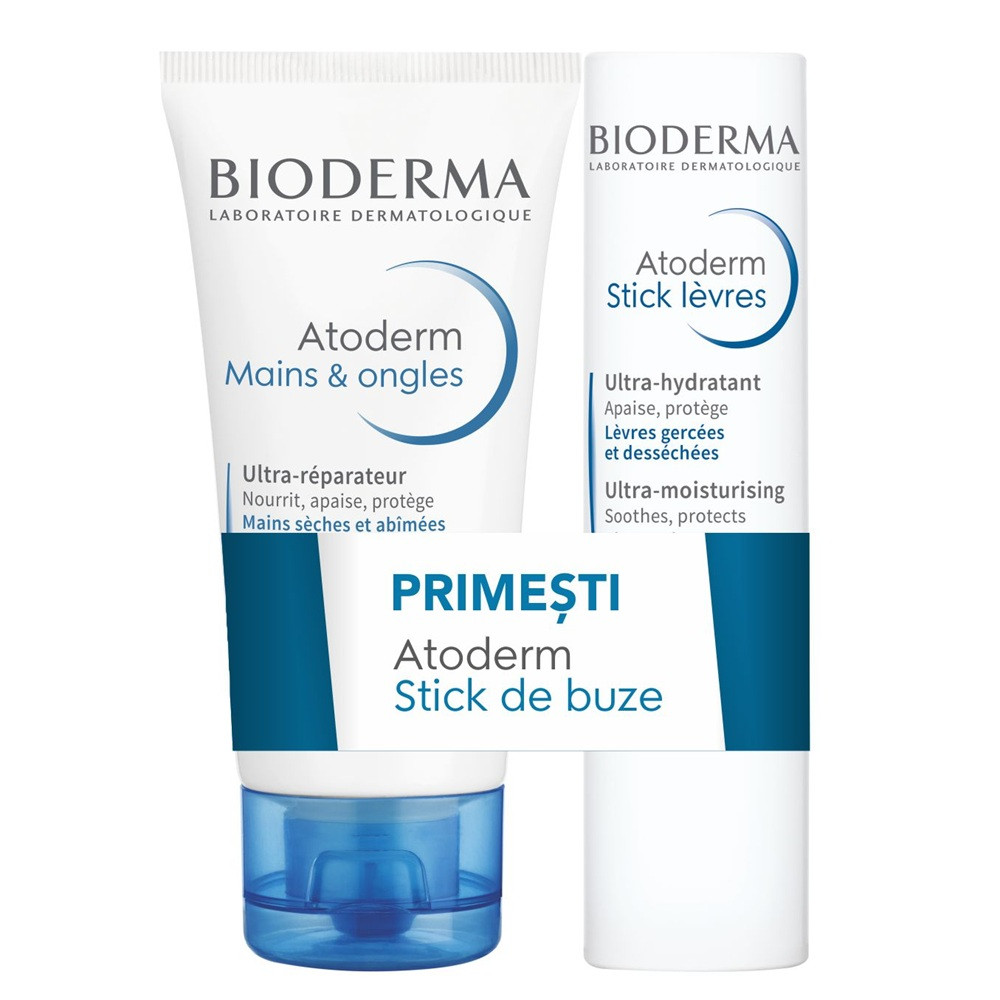 Bioderma Pachet Atoderm crema de maini si unghii 50 ml + stick de buze 4 g