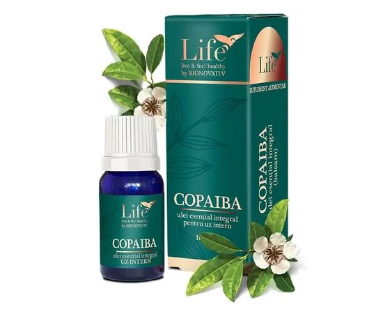 Ulei Esential Integral de Copaiba 10 ml Bionovativ Life Descriere Pădurea tropicală amazoniană este locul de origine al unei minuni vegetale: Copaifera officinalis, un arbore din care se extrage oleo-rezina numită balsam de copaiba. Acest balsam, numit comercial „ulei de copaiba”, era considerat un calmant. Este folosit, de secole, pentru sustinerea sănătătii tractului respirator, digestiv, urinar, dar si pe cea a sistemul cardiovascular sau de apărare. Din această răsină, păstrand marea majoritate a calitătilor terapeutice, se extrage si uleiul esential de copaiba. Acest ulei este studiat pentru efectele sale asupra proceselor inflamatorii, responsabile pentru diverse afectiuni. De asemenea, este cercetată si actiunea acestuia in raport cu agenti patogeni bacterieni sau cu parazitii organismului uman. Compozitie Ulei esential de Copaiba (Copaifera officinalis): 100%. Mod de administrare Se iau cate 1-4 picături de 3 ori pe zi. Fiecare doză se dizolvă in prealabil intr-o lingurită de miere sau intr-un sfert de lingurită de ulei alimentar. Precautii si contraindicatii: A nu se utiliza nediluat. Se utilizează doar diluat in miere sau ulei alimentar, nu si in apă. A nu se consuma de către copii, femei insărcinate sau care alăptează. Atentionari: A nu se lăsa la indemana si la vederea copiilor mici. A se consuma, de preferintă, inainte de: vezi data inscrisă pe ambalaj. A se păstra bine inchis, ferit de umiditate si căldură. Produsul este un supliment alimentar si nu trebuie să inlocuiască un regim alimentar variat si echilibrat si un mod de viată sănătos. A nu se depăsi doza recomandată pentru consumul zilnic.
