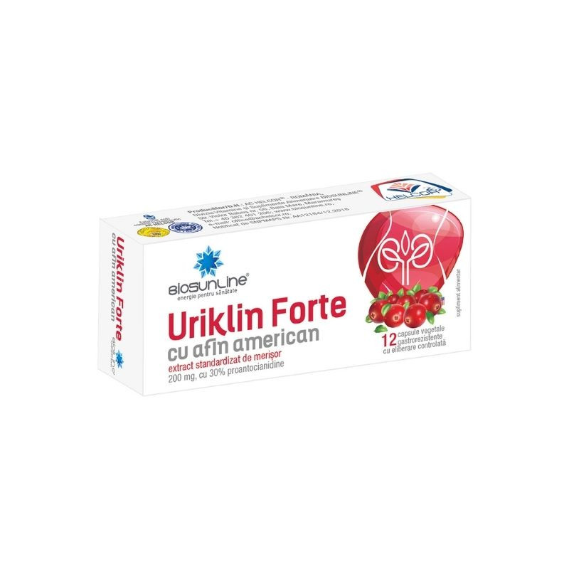 Beneficii BioSunLine Uriklin Forte:Cu fructe de merisor (afin american) – sursa bogata de bioflavonoide si compusi fenolici;Asigura un continut ridicat de proantocianidine**-* * Compusi care, potrivit cercetatorilor, pot preveni infectiile tractului urinar, avand proprietati anti-bacteriene si anti-inflamatoare;Vitamina C contribuie la functionarea normala a sistemului imunitar si protejarea celulelor impotriva stresului oxidativ;Capsulele enterosolubile asigura absorbtia la nivelul intestinului subtire.* extract standardizat de merisor 200 mg, cu 30% proantocianidine.Ingrediente BioSunLine Uriklin Forte:Fiecare capsula contine: extract standardizat de fructe de Merisor-canadian (Vaccinium macrocarpon) standardizat la 30% PAC / proantocianide – 200 mg, vitamina C si excipienti.Capsule de Uriklin Forte sunt vegetale si pot fi administrate si in dietele vegetariene / vegane.Nu contine conservanti, coloranti, arome artificiale, zahar, lactoza, gluten, aromatizanti sau indulcitori artificiali.Mod de administrare BioSunLine Uriklin Forte:Uriklin Forte se administreaza la adulti: adulti – 2 capsule pe zi, cu o cantitate suficienta de apa, inainte de masa.Datorita efectului gastrorezistent (enterosolubil) al capsulei, produsul nu afecteaza stomacul si nu este alterat de sucul gastric, fiind eliberat direct in intestin.Precautii / Atentionari BioSunLine Uriklin Forte:Produsul nu este recomandat copiilor, femeilor insarcinate si celor care alapteaza. Daca simptomatologia urinara este recurenta si/sau nu cedeaza in 48 ore, cereti sfatul medicului in aceasta problema, in vederea unui tratament medicamentos. Infectiile urinare netratate se pot repeta.A nu se administra persoanelor alergice la merisor.Acest produs nu inlocuieste un regim alimentar variat si echilibrat si un mod de viata sanatos.A nu se lasa la indemana si la vederea copiilor mici!