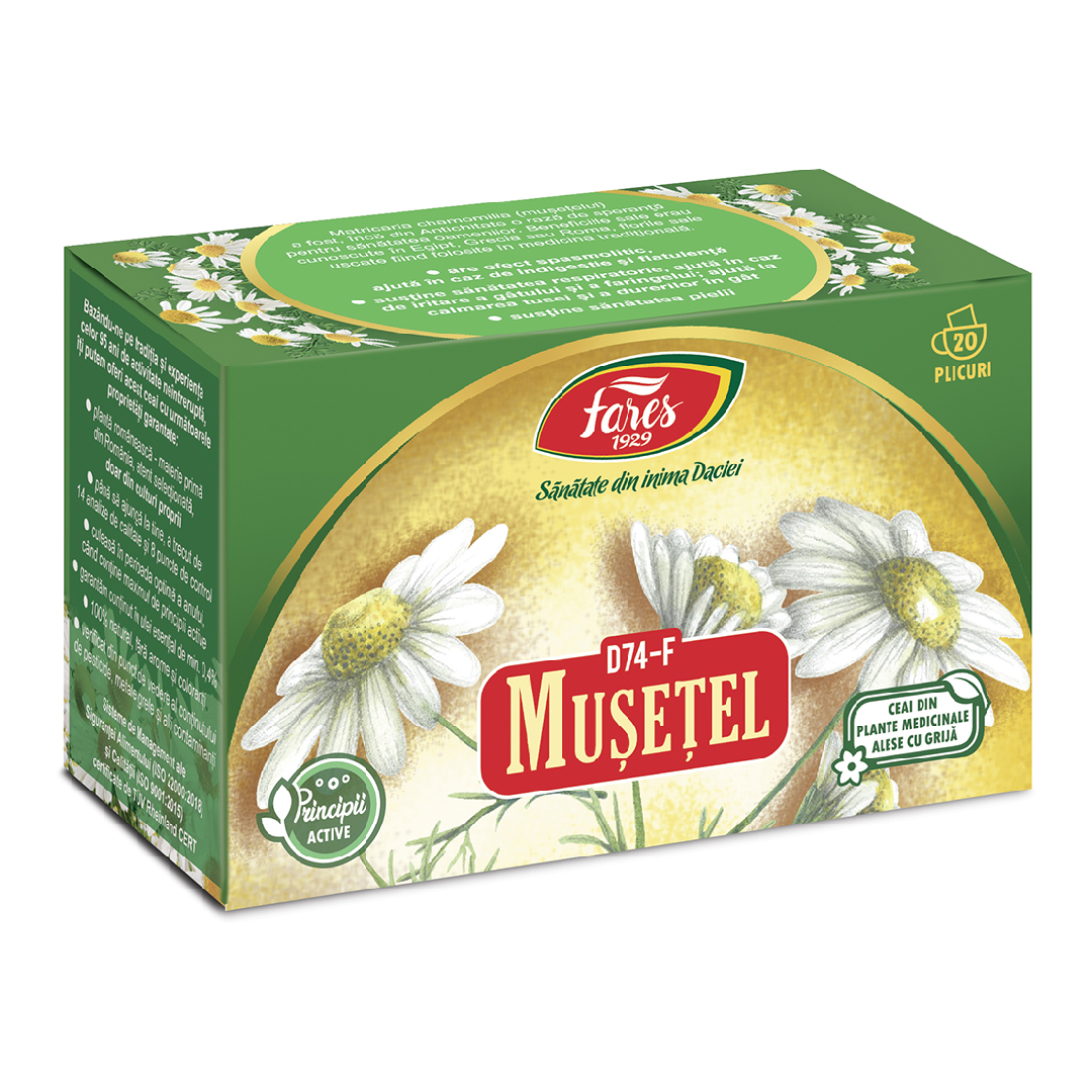 Beneficii Ceai musetel, Fares:Sustine digestia;Sustine sanatatea pielii;Recomandari: colici intestinale, gastrita, ulcer, enterite, colite, balonare.Extern: afte, stomatite, eczeme, rani, ten iritat.Ingrediente:MusetelFlori de musetel (Matricariae flos) care provin de la specia Matricaria recutita L., fam. Asteraceae ce contin mucilagii, flavonoide si ulei volatil bogat in chamazulene si α-bisabolol.Mod de consum:Uz intern: se beau 2-3 cani cu ceai pe zi.Uz extern: comprese, gargara, bai locale.Preparare: Uz intern: Peste un plic se toarna 250 ml apa clocotita si se lasa 10-15 minute acoperit.Uz extern: Peste 2-4 plicuri se toarna 250 ml apa clocotita si se lasa 10-15 minute acoperitAtentionari: Nu se recomanda in caz de hipersensibilitate la aceasta planta.La dozele recomandate nu se cunosc contraindicatii.