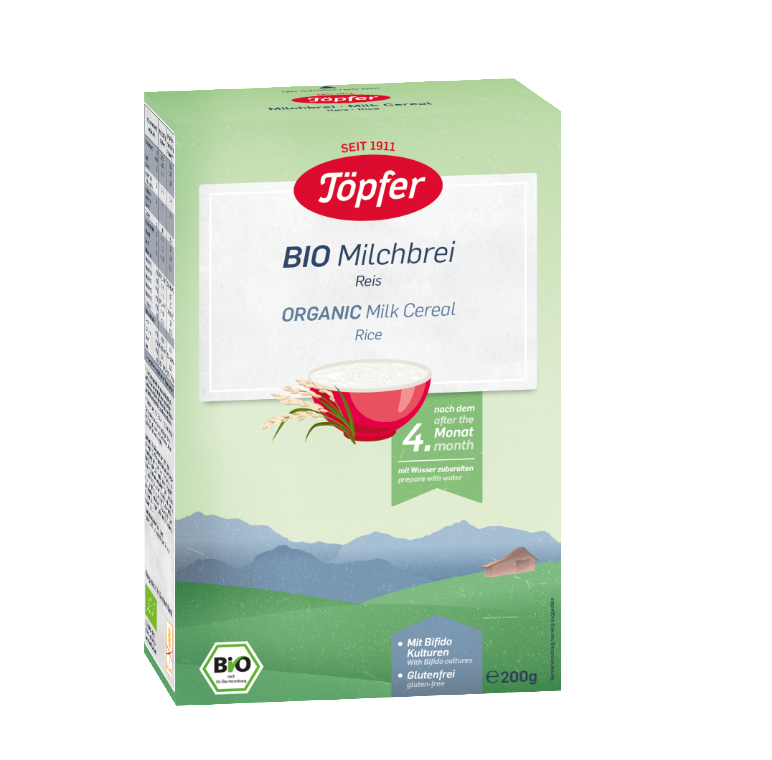 Cerealele Topfer Bio gris de orez cu lapte sunt potrivite de la 4 luni, in cadrul unei alimentatii diversificate, fiind satioase si usor digerabile, produse cu lapte si cereale provenite din agricultura organica. Nu contin gluten, arome sintetice, coloranti si conservanti.