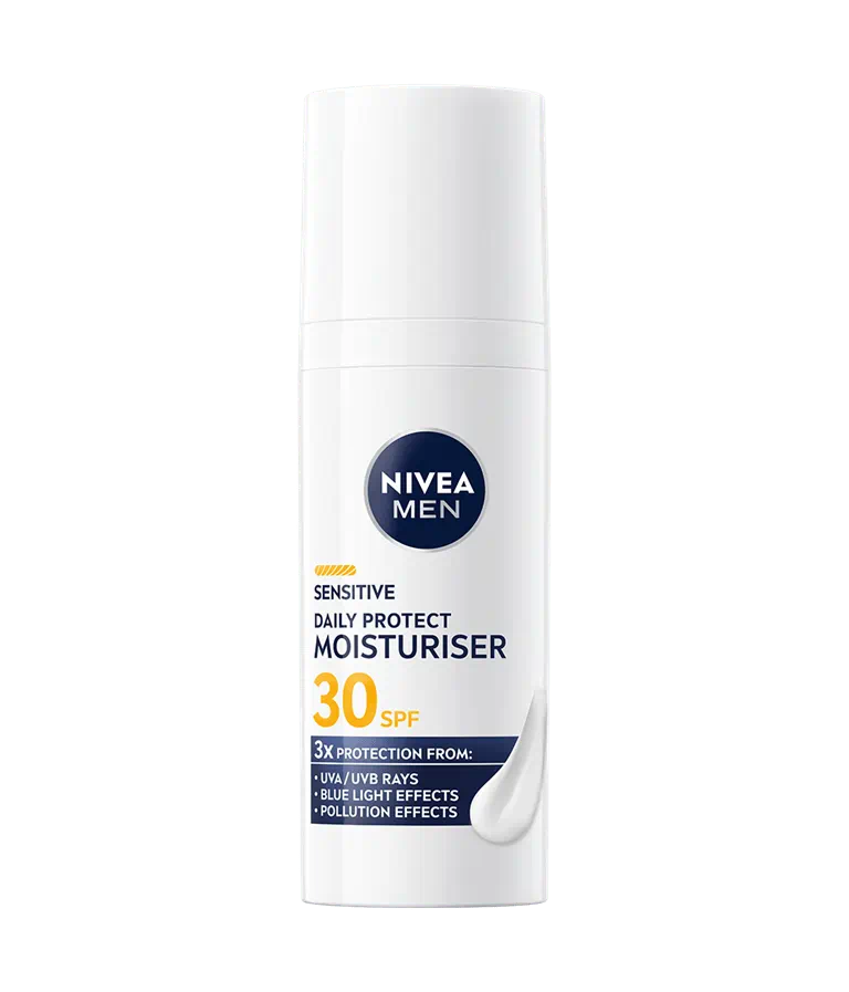 Crema de fata Men Sensitive SPF30 Nivea hidrateaza si protejeaza pielea, oferind protectie UVA/UVB, anti-poluare si impotriva luminii albastre.