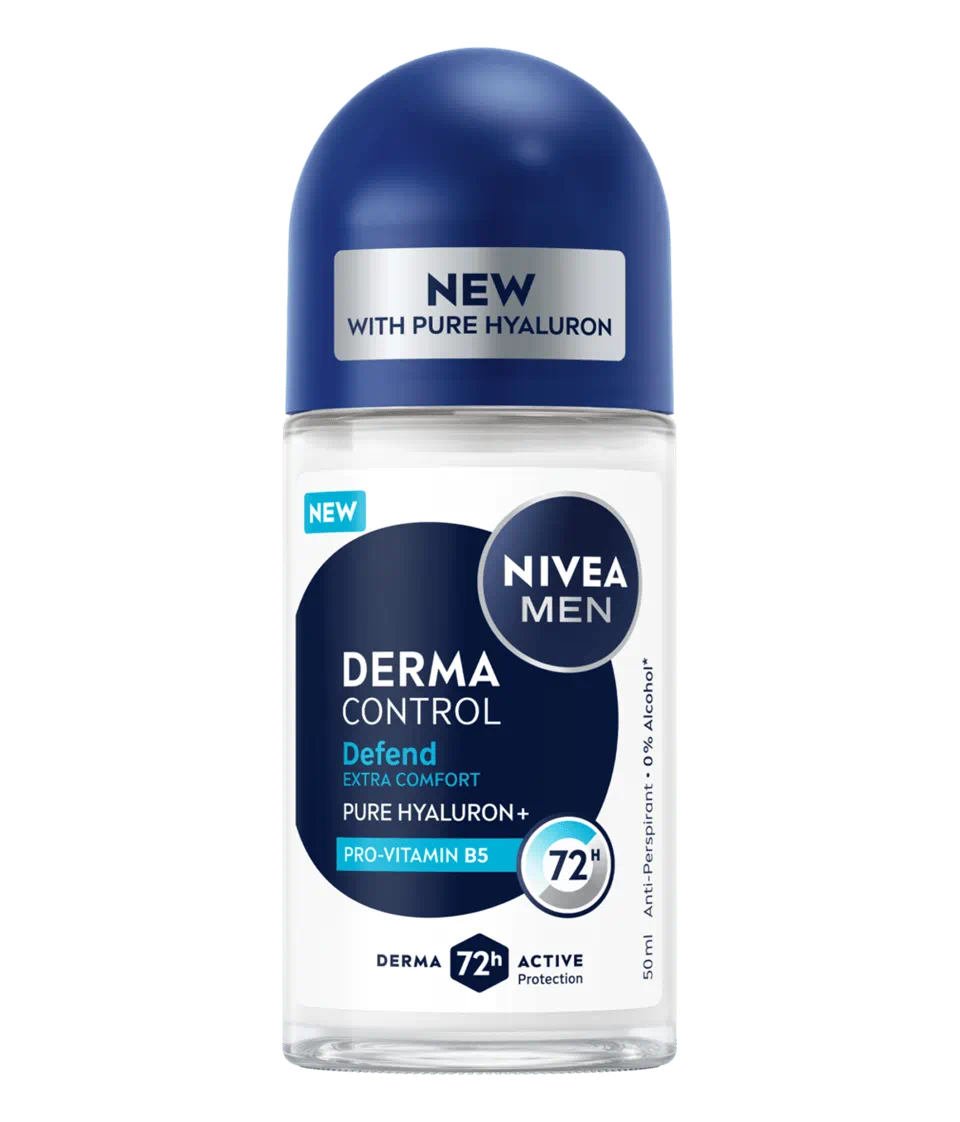 Nivea Men Derma Control Defend roll-on ofera 72h protecție, calmează iritațiile și hidratează pielea, datorită formulei cu acid hialuronic și provitamina B5.