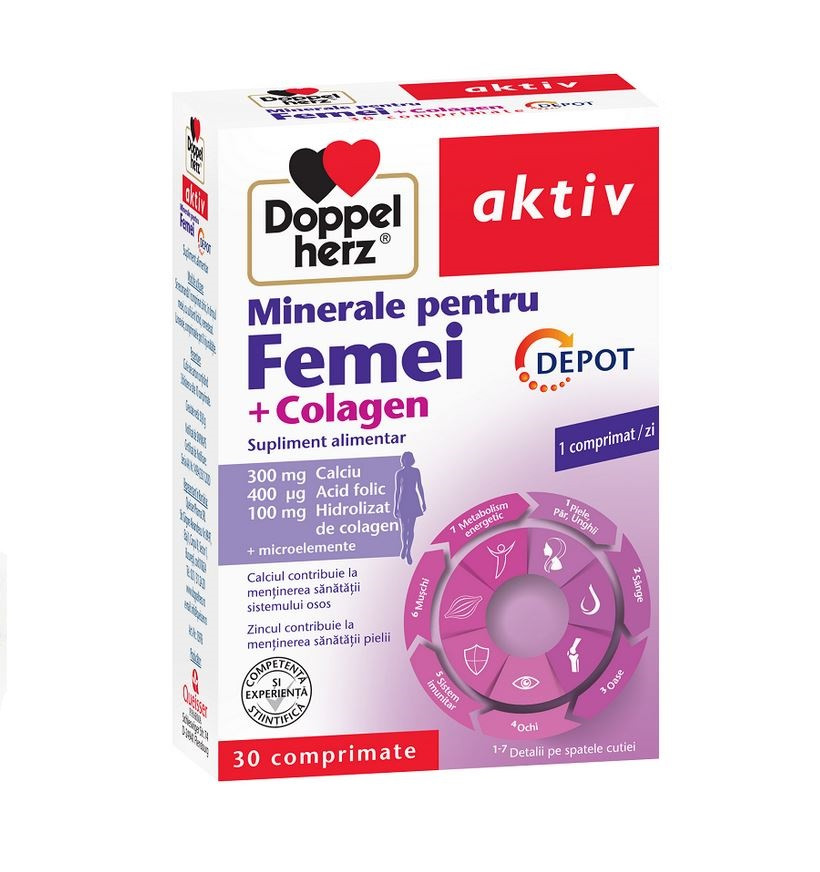 Profită reduceri și preț mic la Doppelherz Aktiv Minerale pentru Femei + Colagen Depot 30 Comprimate, numai la Farmacia Silva.