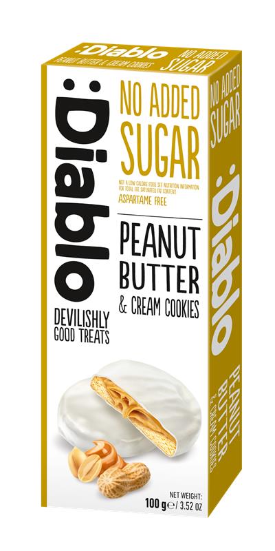 Profită reduceri și preț mic la  Fursecuri fara zahar cu invelis de frisca si umplutura de unt de arahide, 100g, Diablo, numai la Dr. Max.