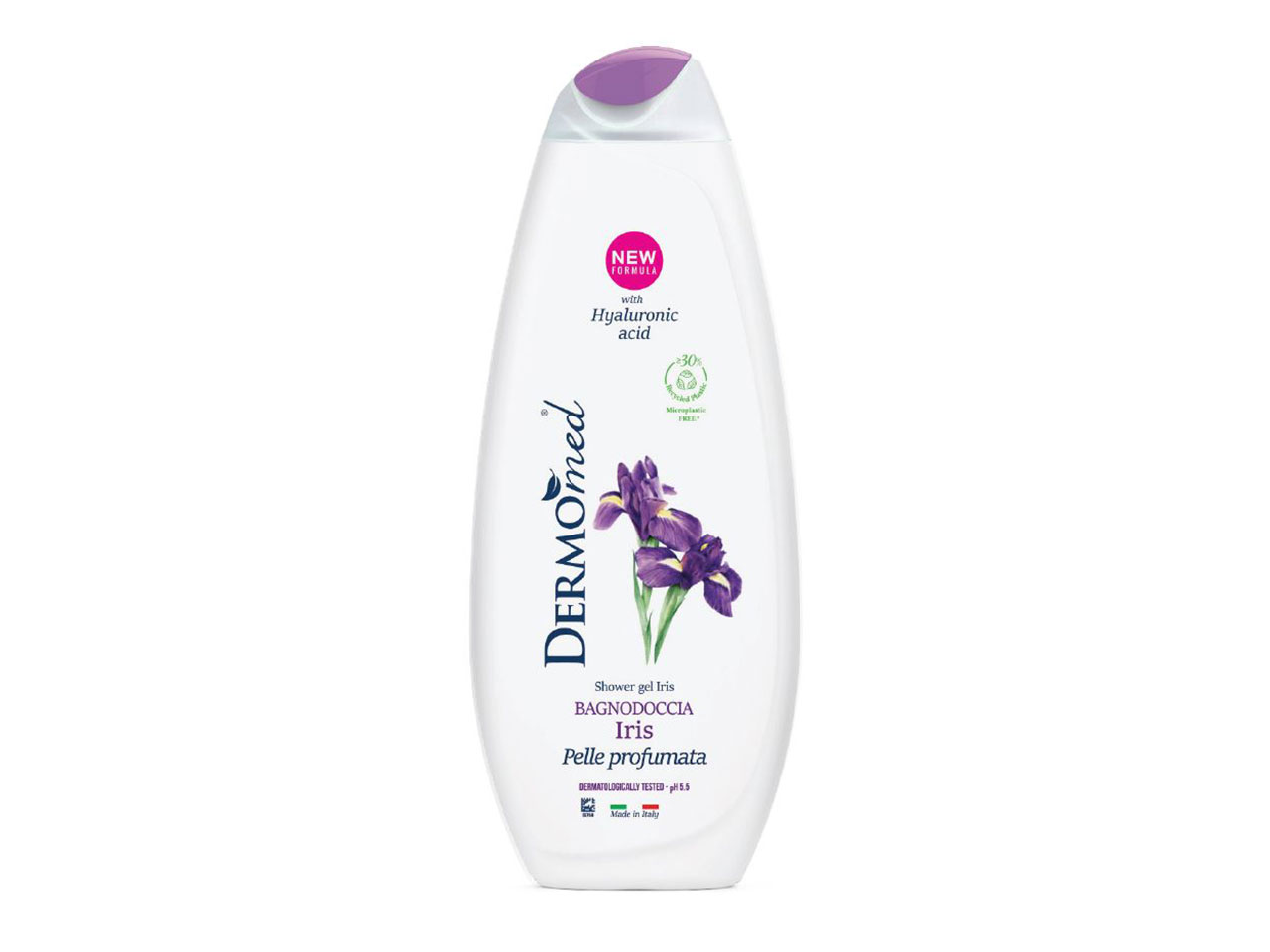 Dermomed gel de dus Iris. Piele parfumata, cu acid hialuronic, ph 5,5, fara microplastic. Testat dermatologic.