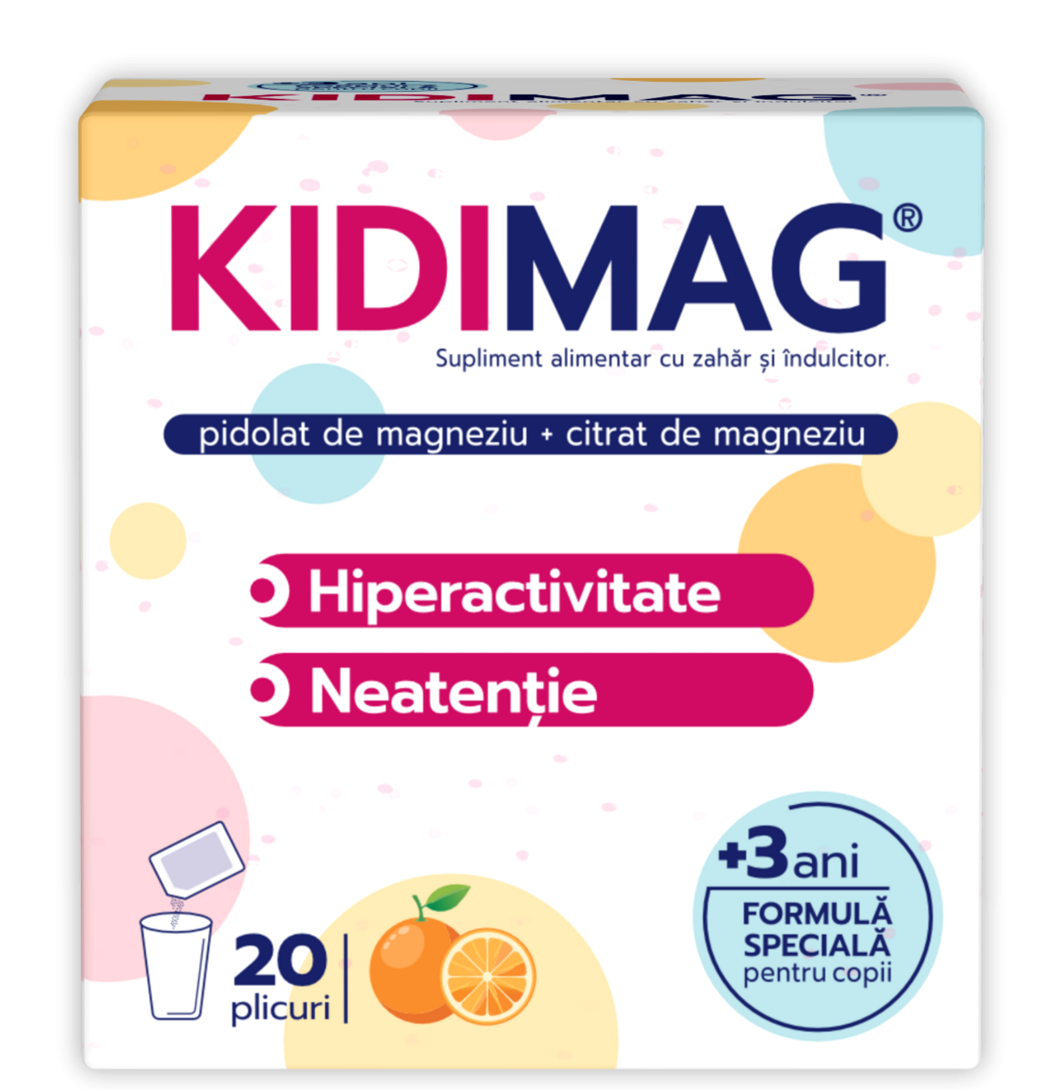 KidiMag, Zdrovit, este un supliment alimentar pentru copii peste 3 ani, cu magneziu si vitamina B6, ce sustine dezvoltarea normala, reduce oboseala si are un gust placut de portocale.