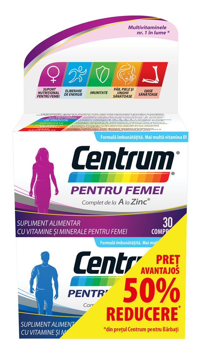 Profită reduceri și preț mic la Pachet Centrum Femei, 30 comprimate + 50% la al doilea produs Centrum Barbati, 30 comprimate, numai la Dr. Max.
