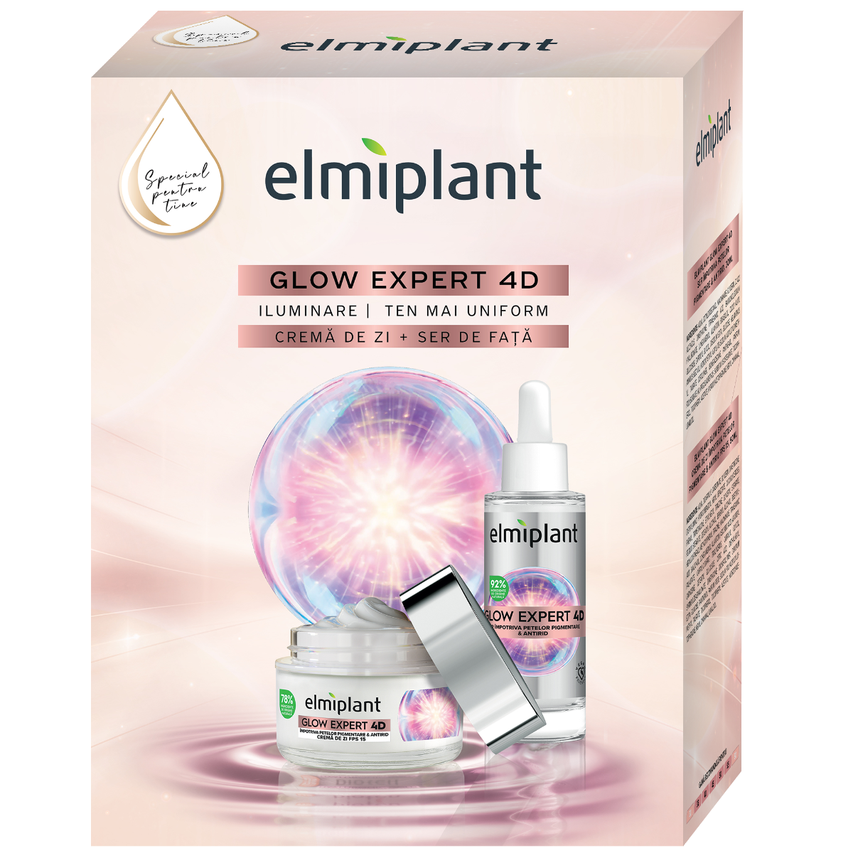 Set Elmiplant Glow Expert 4D cu crema de fata 50ml si ser 15ml, pentru ten luminos, uniform si vizibil mai neted.