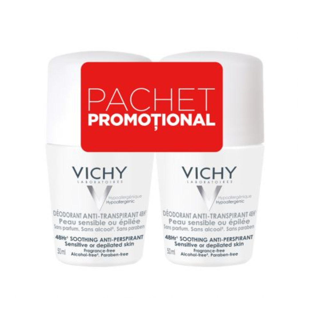 Profită reduceri și preț mic la Pachet Deodorant roll-on antiperspirant fara parfum 48h, 50 ml + 50 ml, Vichy, numai la Spring Farma.
