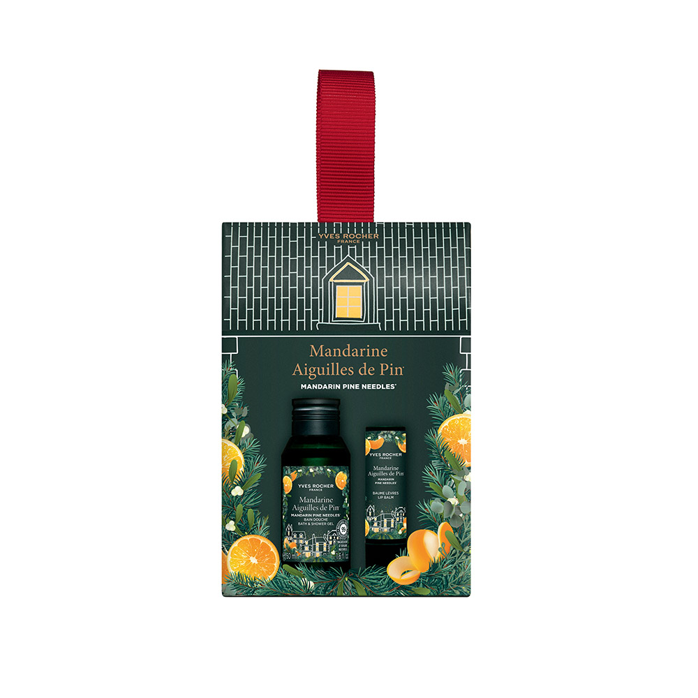 Pachet cadou in editie limitata cu gel de dus si balsam de buze, cu parfum de mandarina si note lemnoase de pin, ideal pentru sezonul sarbatorilor.