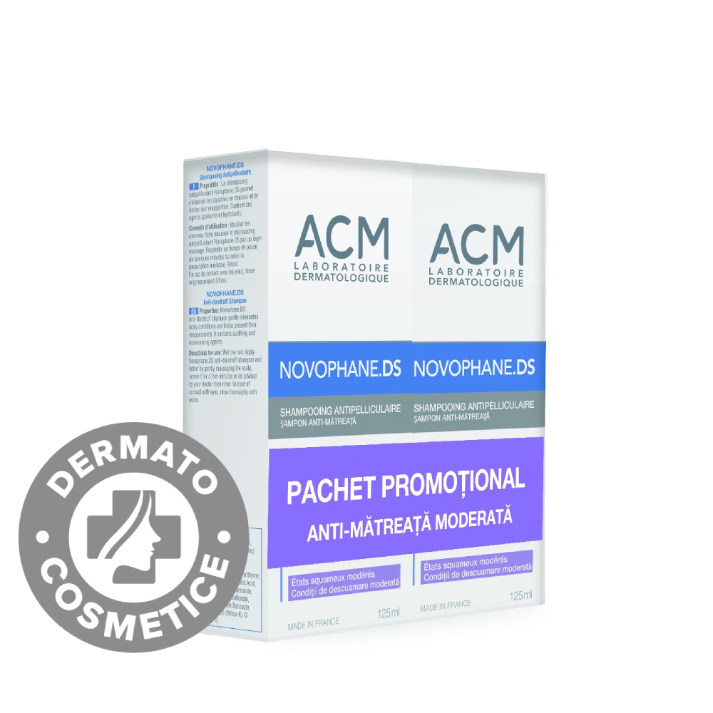 Profită reduceri și preț mic la  Pachet Sampon anti-matreata moderata Novophane D.S., 2x125ml, ACM, numai la Dr. Max.