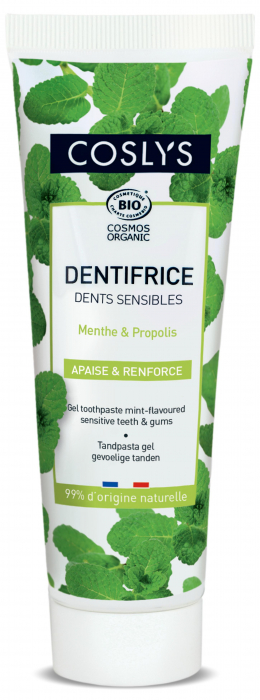 Profită reduceri și preț mic la Pasta de dinti bio pentru dinti si gingii sensibile cu menta si porpolis, 75ml, Coslys, numai la Dr. Max.