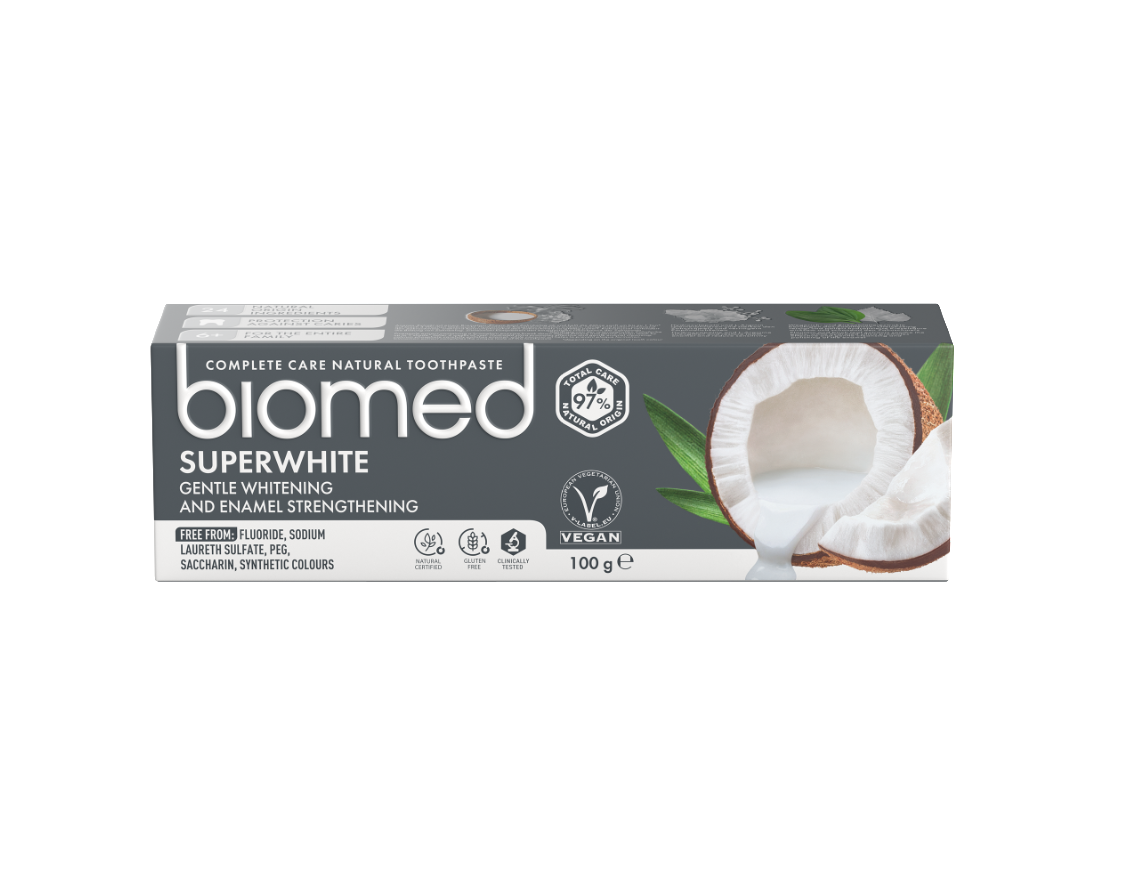 Biomed Superwhite este o pasta de dinti naturala, de ingrijire completa, ce contine ulei natural de nuca de cocos in combinatie cu extract de ananas, pentru un efect delicat de albire a dintilor si un zambet sanatos ce va fi cartea ta de vizita!
