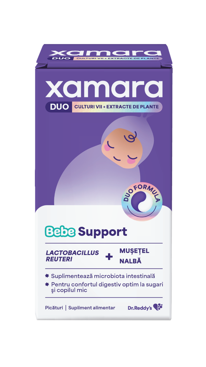 Picaturi Xamara Duo Bebe Support, Dr. Reddy’s supliment alimentar cu Lactobacillus reuteri, musetel si nalba, ce sprijina digestia si confortul abdominal al bebelusilor.