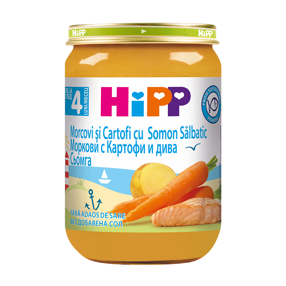 Profită reduceri și preț mic la Piure Morcovi si cartofi cu somon salbatic +4 luni, 190g, Hipp, numai la Dr. Max.