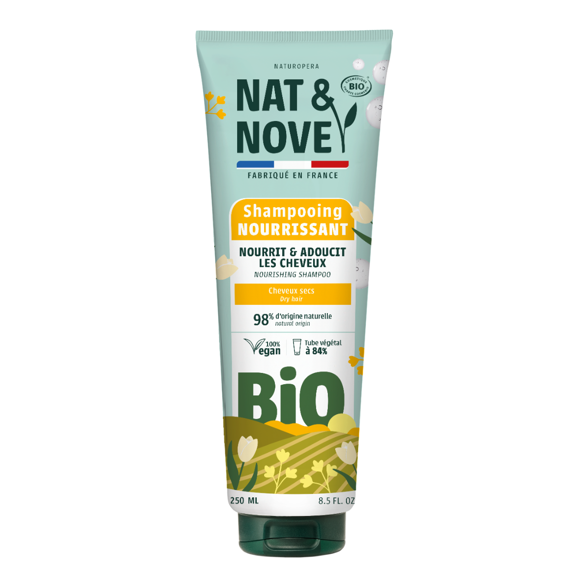 Sampon bio hranitor pentru par uscat, cu extract de ovaz bio, curata delicat, hraneste fibra capilara si reda supletea si stralucirea naturala a parului, Nat&Nove.