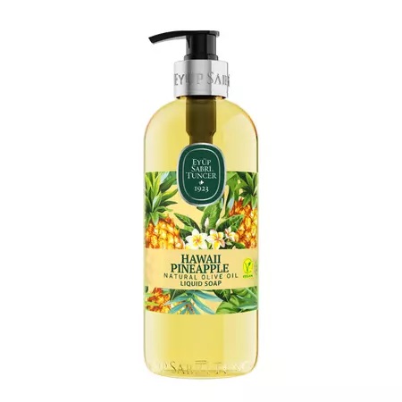 Sapun lichid Eyup Sabri Hawaii Pineapple cu ulei natural de masline, curata delicat, hidrateaza si catifeleaza pielea, lasand un parfum exotic intens de ananas.