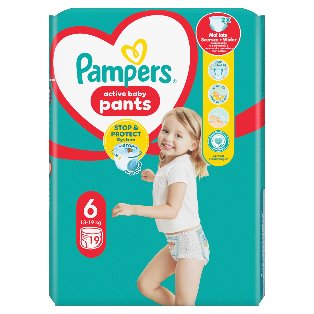 Scutecele-chilotel Pampers Pants sunt primele scutece-chilotel cu buzunar Stop & Protect care, in combinatie cu fixarea de jur-imprejur, ofera protectie impotriva scurgerilor de orice fel de pana la 12 ore.