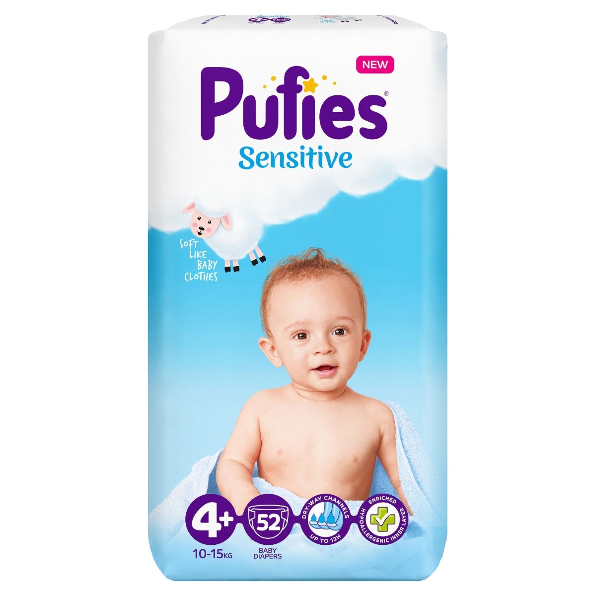Profită reduceri și preț mic la Scutece Sensitive Nr. 4+ 10-15kg, 52 bucati, Pufies, numai la Dr. Max.