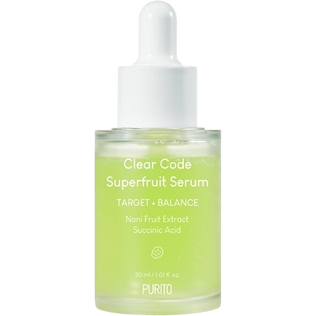 Serum Purito Clear Code Superfruit – formula vegana cu extract de noni, acid succinic si complex botanic ce regleaza sebumul, calmeaza si reduce iritatiile.