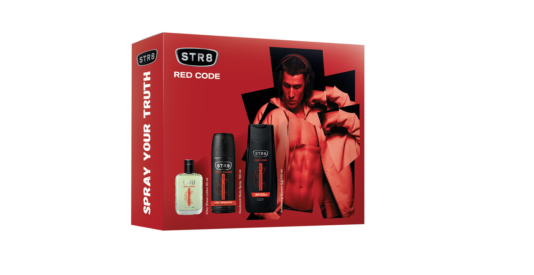 Set STR8 Red Code cu lotiune dupa ras 50ml, deodorant spray 150ml si gel de dus 250ml, aroma ambery-woody intensa, pentru barbatul energic.