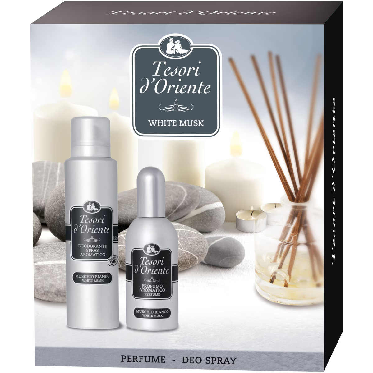 Set cadou Tesori d’Oriente cu Apa de toaleta 100ml si Deodorant spray 150ml, aroma White Musk, pentru prospetime si rafinament zilnic.