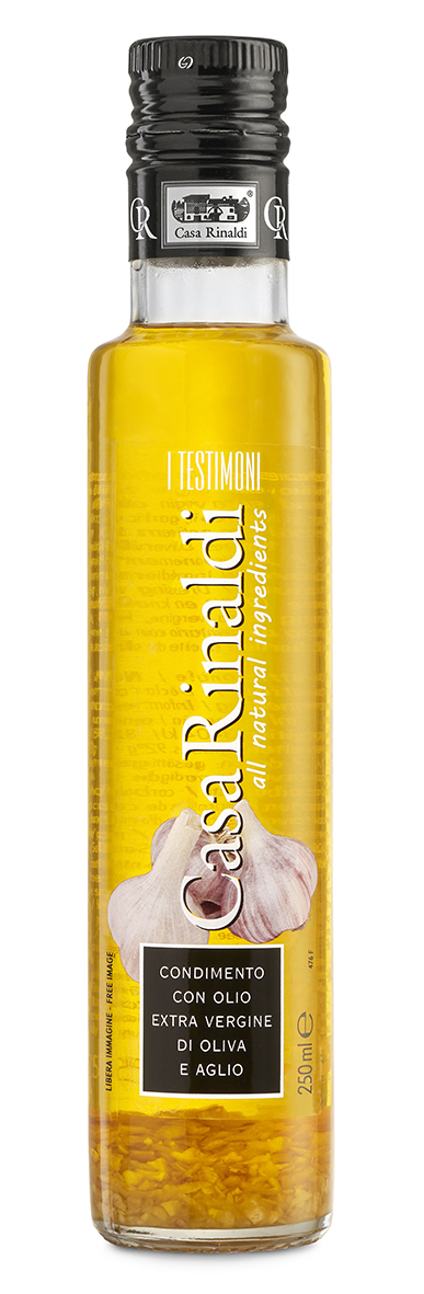 Ulei de masline extravirgin aromatizat cu usturoi Casa Rinaldi, 100% natural, cu gust intens si aroma proaspata, ideal pentru legume, carne, peste si sosuri.