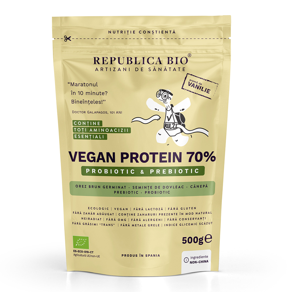 Profită reduceri și preț mic la Vegan Protein 70% Probiotic & Prebiotic vanilie ecologica, 500g, Republica Bio, numai la Dr. Max.