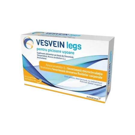 Vesvein Legs, Alfasigma, este un supliment alimentar ce sustine circulatia venoasa si reduce senzatia de picioare grele, obosite si umflate, prin combinatia de diosmina, hesperidina, ruscus si bromelaina.