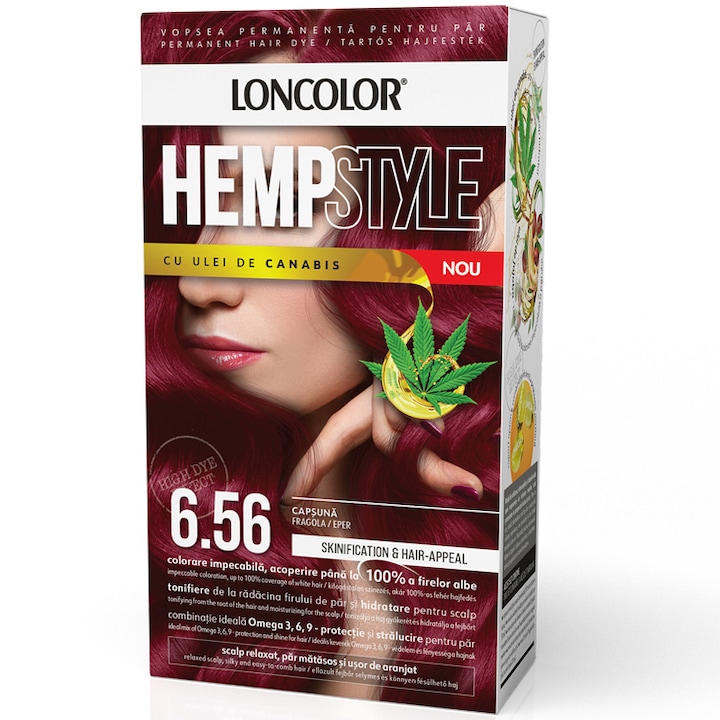 Vopsea de par permanenta HempStyle Nr. 6.56, 110ml, Loncolor ofera acoperire pana la 100% a firelor albe si stralucire prin Omega 3, 6 si 9.
