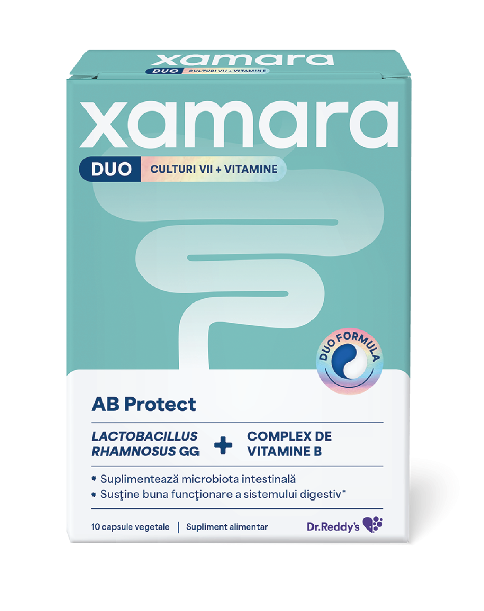 Xamara Duo AB Protect de la Dr. Reddy’s este un supliment alimentar cu probiotice, vitamine si minerale, conceput pentru sustinerea florei intestinale si a echilibrului nutritional in perioade solicitante.