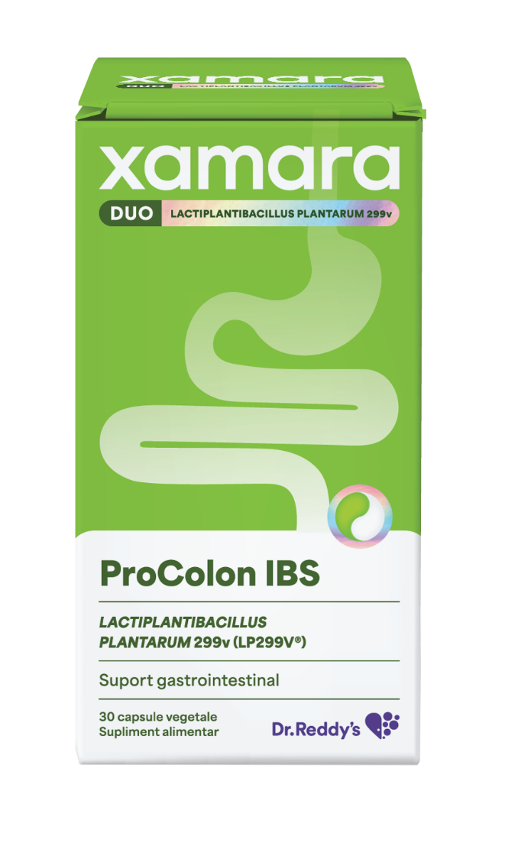 Xamara Duo ProColon IBS, Dr. Reddy’s supliment alimentar cu Lactiplantibacillus plantarum, ce contribuie la echilibrul microbiotei intestinale si la reducerea simptomelor asociate sindromului de intestin iritabil (IBS).